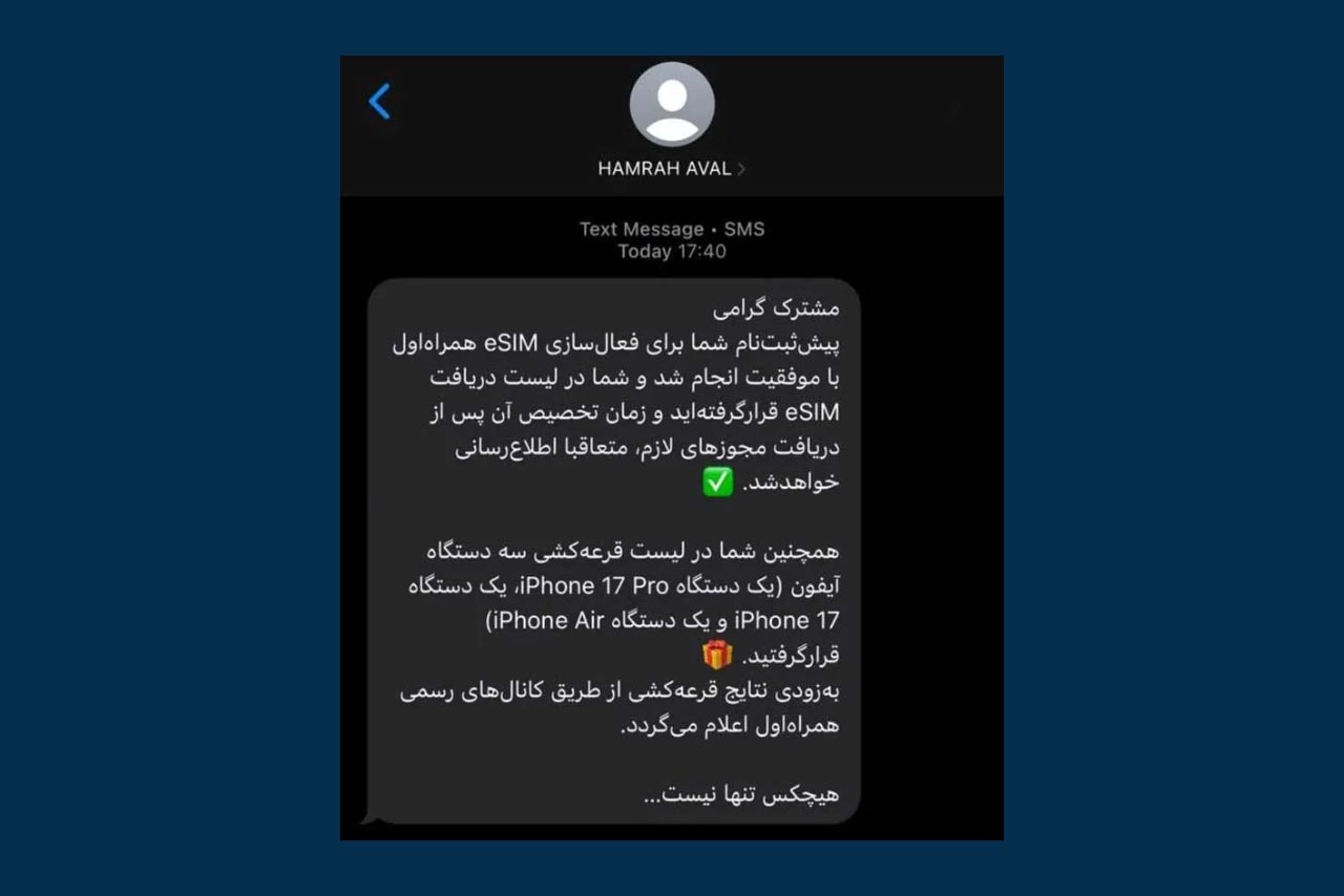 ایرانسل نیز برای تشویق کاربران به استفاده از eSIM، جوایز ویژهای را در نظر گرفته است. تمام افرادی که تا پایان شهریور ۱۴۰۴ برای فعالسازی eSIM پیشثبتنام کنند، در قرعهکشی شرکت داده خواهند شد. جوایز این قرعهکشی شامل گوشیهای جدید iPhone 17، iPhone 17 Pro و iPhone 17 Air، ساعت هوشمند Apple Watch Ultra 3 و همچنین بستههای اینترنت ۱۷ گیگابایتی ماهانه برای ۱۷ نفر به مدت ۱۷ ماه است. همچنین، تمامی افرادی که از بازارگاه ایرانسل گوشیهای سازگار با eSIM خریداری کنند، در این قرعهکشی شرکت داده میشوند.