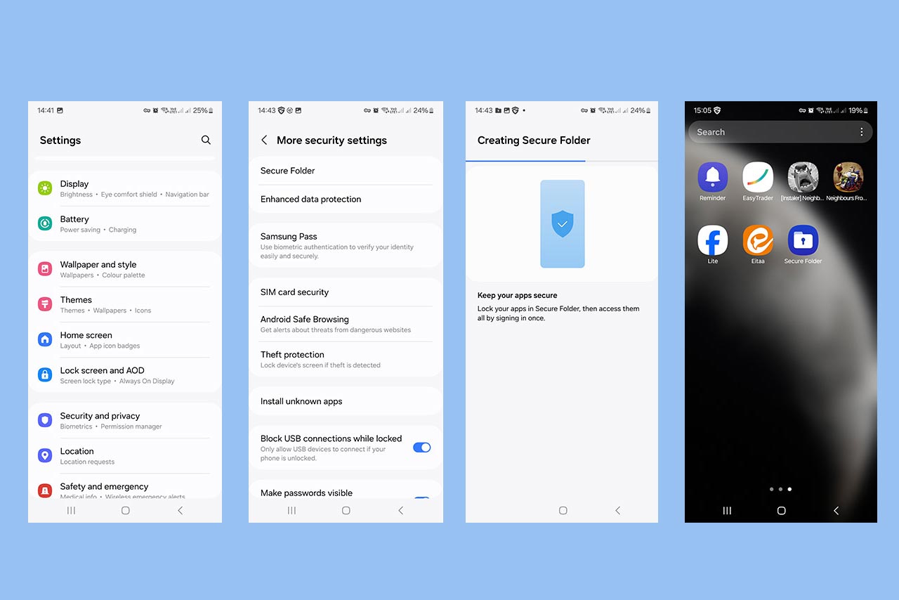 استفاده از پوشهی امن سامسونگ یا Secure Folder برای مخفیکردن برنامهها با امنیت بالا کاربرد دارد. شما در این روش میتوانید از رمزعبور استفاده کنید و امنیت برنامهها را افزایش دهید. برای استفاده از این قابلیت فقط کافیست: