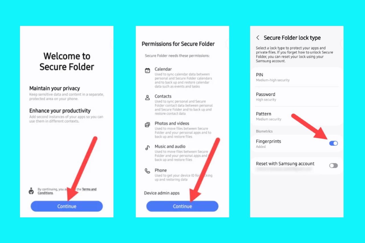 - با فعالکردن گزینهی Reset with Samsung account (بازیابی با اکانت سامسونگ) میتوانید رمزعبور پوشهی امن را از طریق حساب سامسونگ بازیابی کنید.