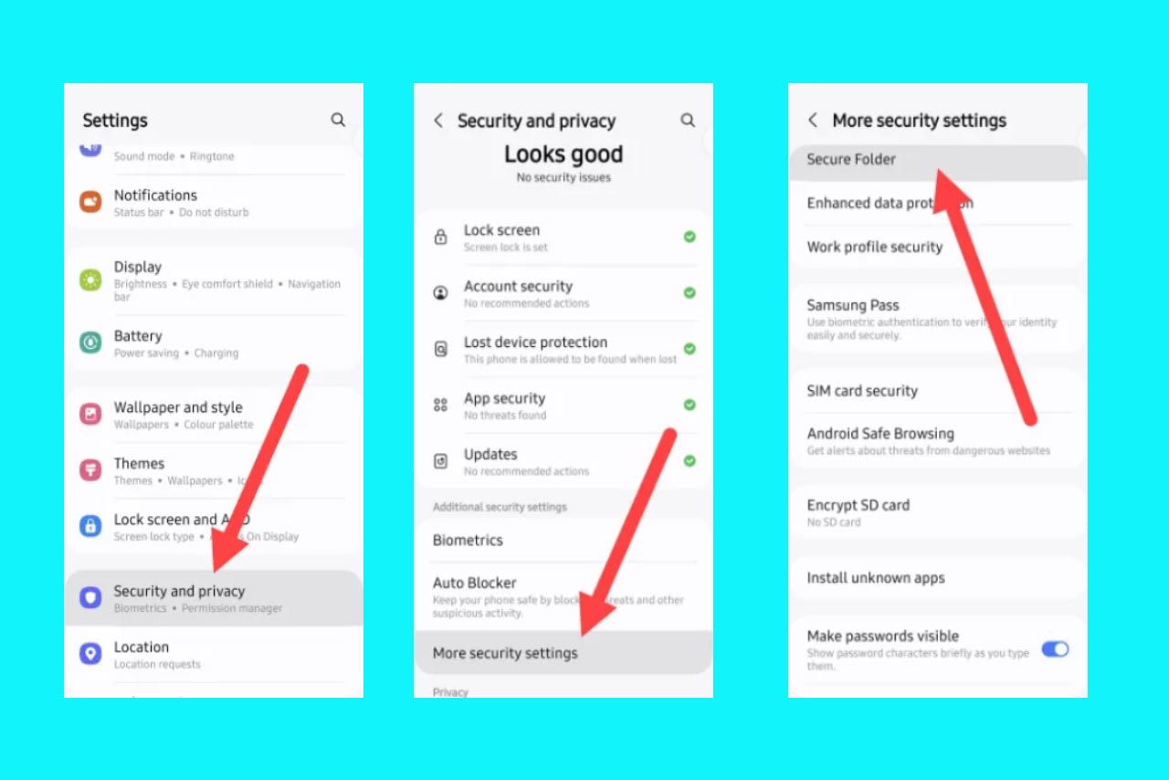 برای رمز گذاشتن روی برنامهها در گوشیهای سامسونگ روش استفاده از قابلیت Secure Folder و قابلیت App Lock را به شما آموزش میدهیم. Secure Folder یا پوشه امن، یک قابلیت امنیتی و حریم خصوصی پیشرفته است؛ که به طور انحصاری در گوشیهای هوشمند سامسونگ، از رابط کاربری One UI 4 به بعد ارائه میشود. در این روش امن برای باز کردن برنامه ها نیاز به یک روش احراز هویت همچون رمز عبور، الگو، پین یا اثر انگشت مجزا دارید. هدف اصلی پوشه امن حفاظت از دادهها، فایلها و برنامههای بسیار شخصی در برابر دسترسیهای غیرمجاز است. برای استفاده از این قابلیت مراحل زیر را انجام دهید:
