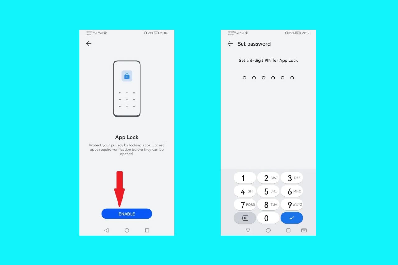 - درصورت انتخاب Custom PIN وارد صفحهای میشوید؛ که باید یک پین ۶ رقمی برای قفل برنامهها تعریف کنید.