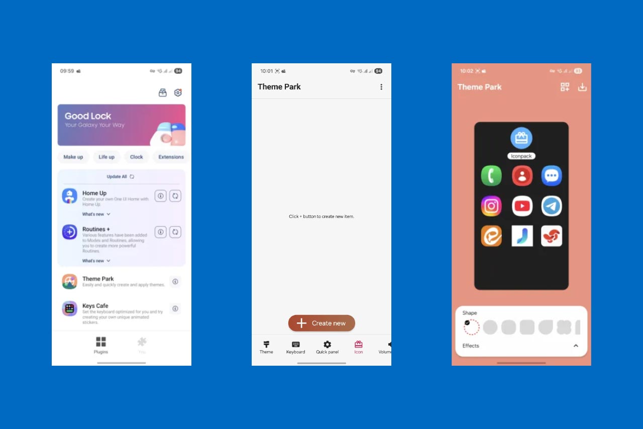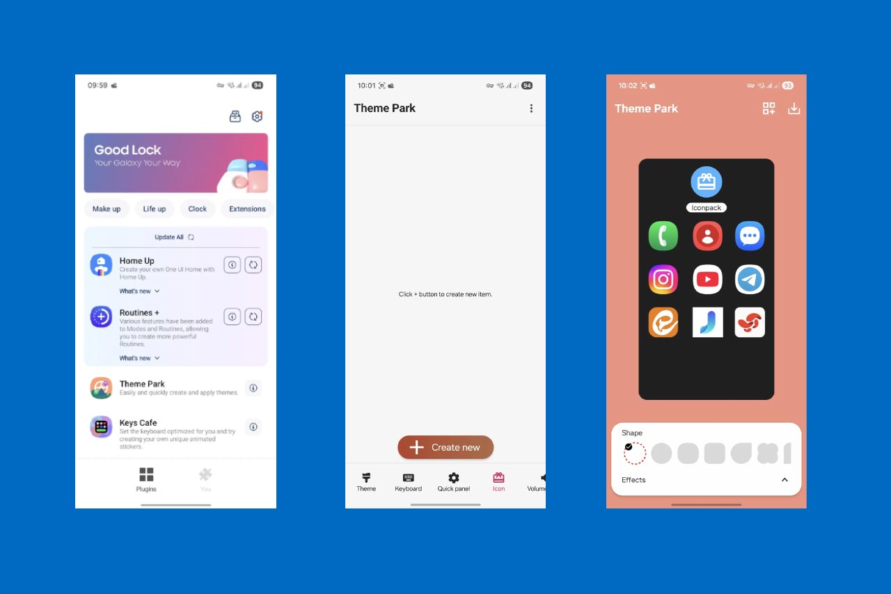 Good Lock یک پلتفرم یا برنامه مادر است و Theme Park یک ماژول تخصصی درون آن است؛ که مسئولیت ساخت و اعمال آیکونپکهای سفارشی، همچون افکت شیشهای، را بر عهده دارد. روش Good Lock برای کاربرانی مناسب است که میخواهند کنترل کاملی بر میزان شفافیت، درخشندگی و رنگهای جلوه شیشهای داشته باشند و تم خود را کاملاً شخصیسازی کنند. برای استفاده از این برنامه مراحل زیر را انجام دهید: