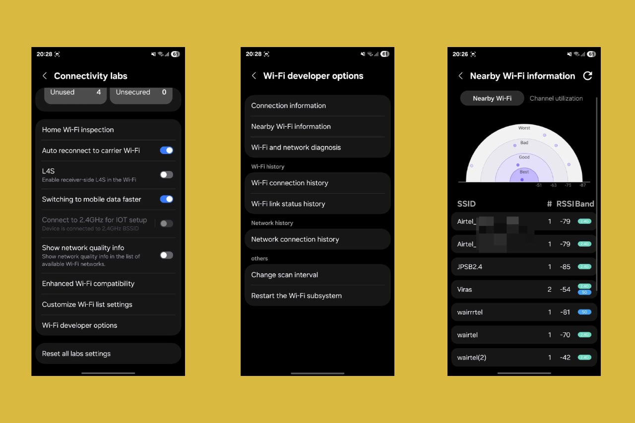 در این شرایط، منوی Connectivity Labs ابزاری کاربردی در اختیار شما قرار میدهد. این ابزار Nearby Wi‑Fi Information نام دارد؛ و قادر است بهطور دقیق تمام شبکههای وایفای اطراف را اسکن کرده و اطلاعاتی کاربردی همچون قدرت سیگنال دریافتی و باند فرکانسی را برای هر شبکه نمایش را ارائه دهد.
