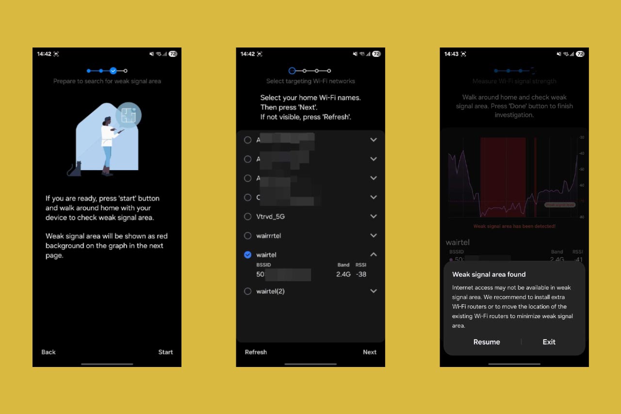 برای استفاده از این ابزار، کافیست در قسمتهای مختلف خانه حرکت کنید. سیستم بهصورت لحظهای قدرت سیگنال وایفای را اندازهگیری میکند و آن را در قالب نموداری گرافیکی نمایش میدهد. این نمودار شما را قادر میسازد نقاط با سیگنال قوی و ضعیف را بهسادگی تشخیص دهید. روند نمودار در مناطقی که سیگنال ضعیف دارند، به شکل کاهشی نمایش داده میشود و در صورت عبور از محدودهی مجاز، پسزمینهی آن به رنگ قرمز درمیآید.