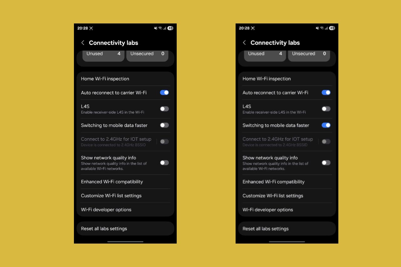یکی از رفتارهای معمول در گوشیهای سامسونگ، جابهجایی خودکار به اینترنت سیمکارت هنگام تشخیص قطع شدن سیگنال وایفای است. این فرآیند انتقال معمولاً لحظهای نیست؛ بنابراین ممکن است برای چند ثانیه با قطعی کامل دسترسی به اینترنت مواجه شوید. خوشبختانه، منوی Connectivity Labs برای حل این مشکل گزینهی Switching to mobile data faster را ارائه میدهد. فعالسازی این قابلیت، انتقال خودکار از اتصال وایفای به دیتای همراه را به شکل لحظهای امکان پذیر میکند. نتیجهی این تنظیم، حذف یا به حداقل رساندن کامل قطعیهای ناگهانی در حین مکالمات ویدیویی، استریم یا دانلودهایی است که به یک اتصال پایدار نیاز دارند.