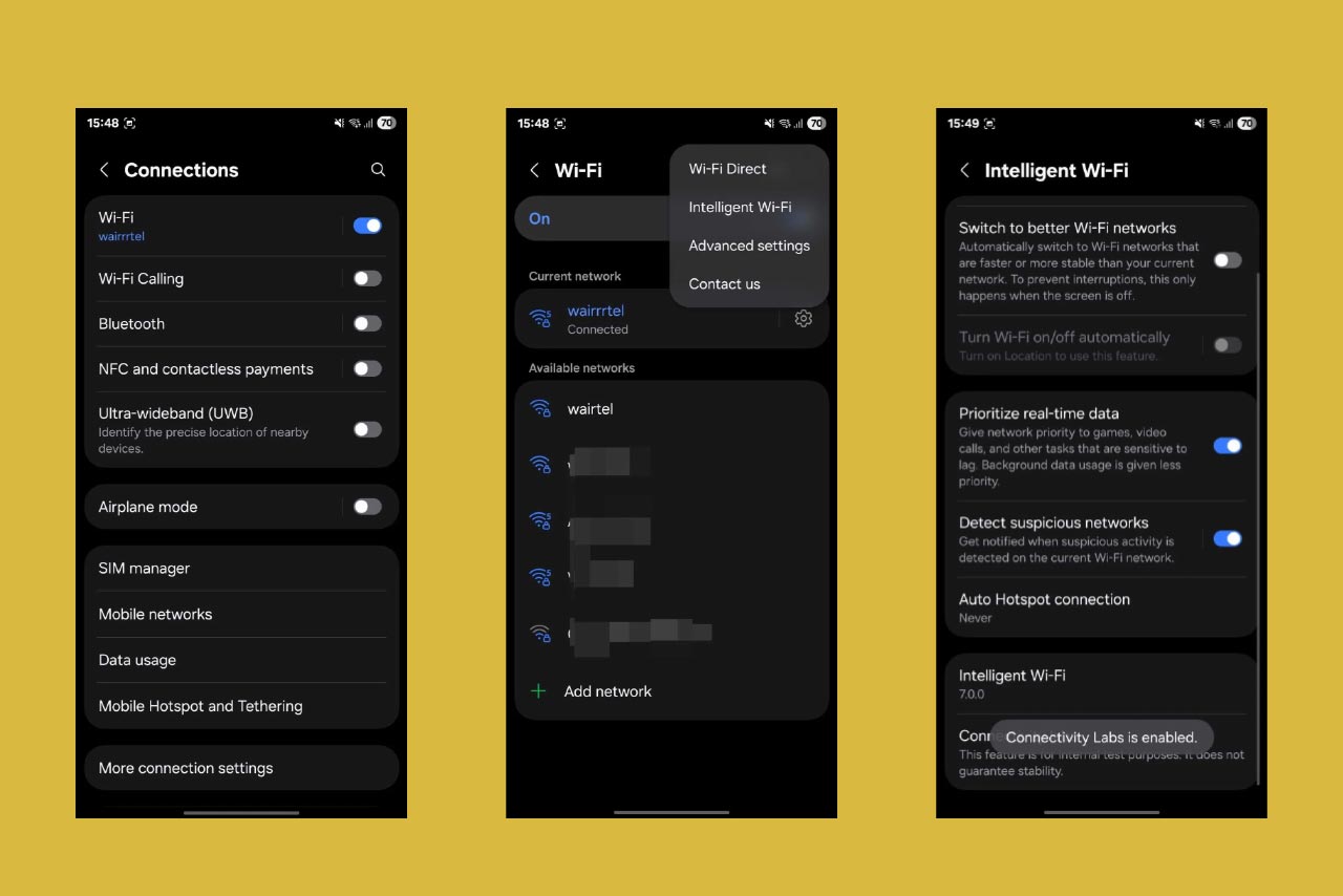 - در قسمت پایین صفحه هفت مرتبه روی گزینه Intelligent Wi-Fi ضربه بزنید تا پیغام Connectivity labs is enabled به شما نمایش داده شود.
