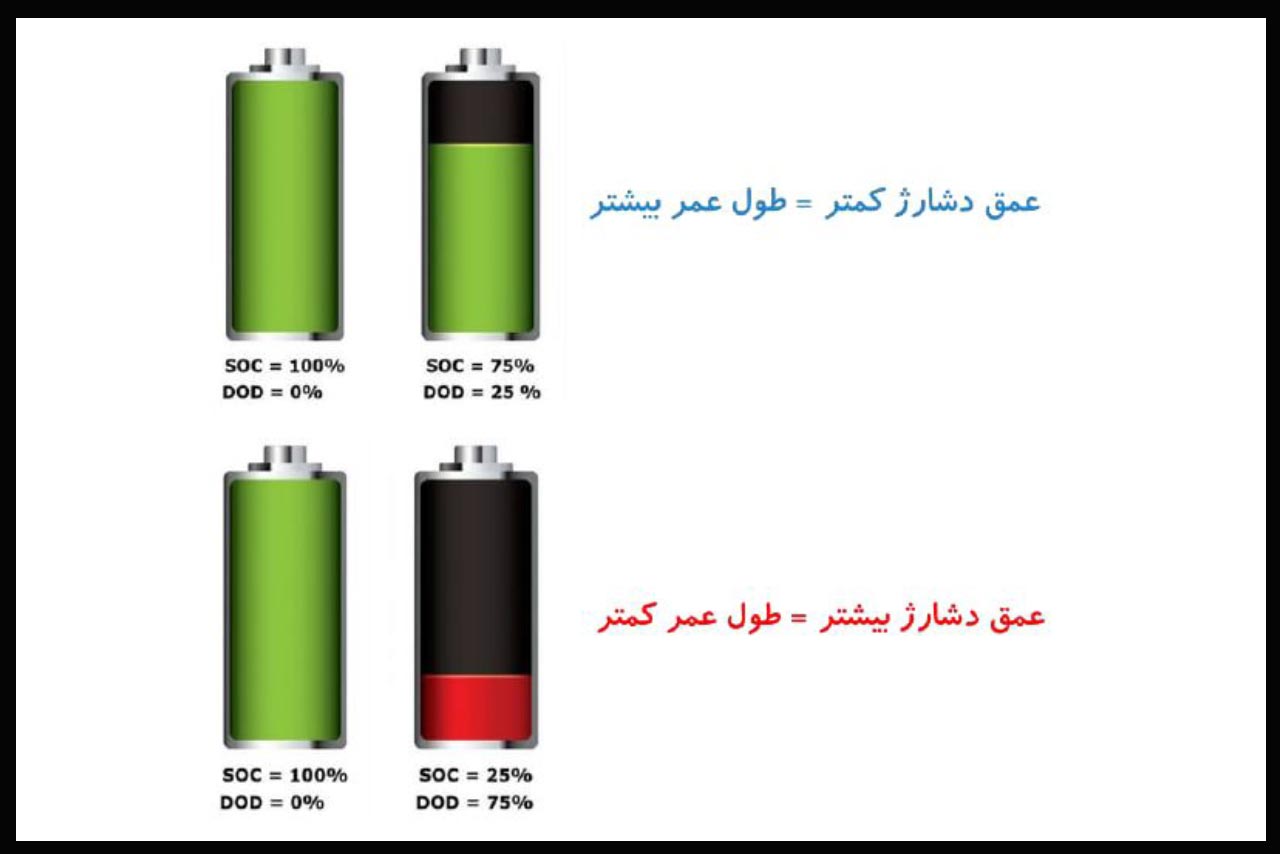 عمق دشارژ (Depth of Discharge یا DoD) معیاری مهم برای سنجش سلامت باتریهای قابل شارژ، مخصوصاً باتریهای لیتیوم-یون است. عمق دشارژ، ، درصد تخلیه شارژ باتری نسبت به کل ظرفیت آن است. این مفهوم کاملاً در تضاد با وضعیت شارژ قرار دارد؛ به این معنی که اگر باتری 100 درصد شارژ باشد، عمق دشارژر آن 0 درصد است. و اگر شارژ باتری به 20 درصد برسد، 80 درصد باتری خالی بوده و عمق دشارژ آن 80 درصد است.